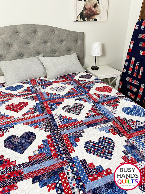 Today I'm sharing a red, white, and blue Quilty Cabins quilt in the Throw size.  This quilt pattern combines log cabin blocks with heart blocks all in one!  The hearts are pieced right in, and this pattern is all traditional piecing and does not include any applique.  You can easily make it!